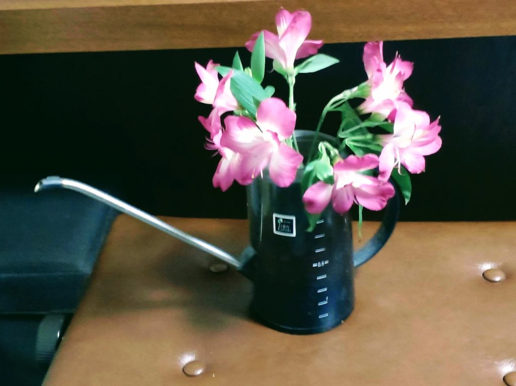昨日、買ってきたアルストロメリアが一日でくたっとなってしまった。茎を切り直し、水を吸わせると蘇り、嬉しくなりました。