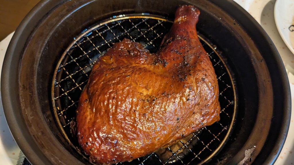 仕事が片付いたら、2次会にスモークチキンと、残りの赤ワイン+ボウモア。イイ感じにスモークされて美味しそうです。年季が入っているので、お店のより美味しいかも。