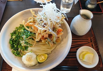 私は「山ぶっかけ」(880円)私も冷たいツユにしてみました。こだわりの玉子と山芋が最高でした。これは美味しい~。それにしても、まず1本だけうどんを食べてみたのですが、ズシッと重く、凄くコシが強いうどんに、かなり驚きました。はじめさんのかき揚げのおすそ分けもあって、ボリュームがありました。