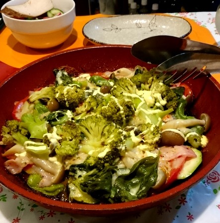 ブロッコリー、ししとう、トマト、しめじ、ズッキーニ、ベーコンとモッツアレラチーズのグリル。