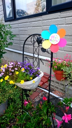 Welcomeと書かれているのが良いです。トレリスに飾った寄せ植え。アイビーゼラニウムとコリウス。コリウスがどんどん大きくなっています。