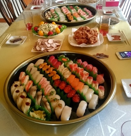 7人ですが、このお寿司の量!私だけ缶ビール350mlを2本飲みました。母は、ほんの少しだけ飲んで「苦い」と数回言っていました。(^^; みんなが大好きな「かねしち」さんのザンギを予約して届けました。大きなパックに入った礼文の生うにを2つお土産に戴いたのですが、母はお持ち帰りできないので、凄い量の生うにを美味しそうに食べていました。嬉しかったのでしょう。
