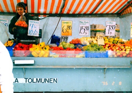 野菜や果物もカラフル!一度だけスーパーに入ってみましたが、店員さんがとても明るく親切でした。フィンランド語は「キートス」(ありがとう)だけ。あとは、ゆっくりな英語が通じました。フィンランド語は難しいです。何しろ、ムーミンの発音が難しくて、何度も舘野先生の奥さまマリアさんにやり直しをさせられました。ちなみにセンター試験の問題は正解でした。