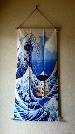 暑いので、玄関のタペストリーを「波富士」に替えました。”富士山は静岡県と山梨県にまたがる活火山で、標高は3776m日本最高峰である。その優美な風貌は、海外でも日本の象徴として広く知られています。富士山の登山者数は世界一を保ち、約3割が外国人です。”と解説が書かれています。