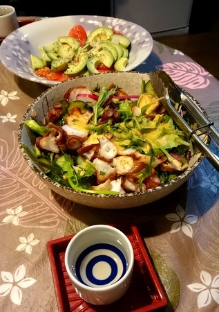 大人の生徒さんのレッスンを終えて午後8時の夕食。フレッシュなタラゴン、パクチーなどのハーブを使ってサラダ。紫の水菜、ラディッシュ、キュウリなどにタコを入れるとゴージャスなサラダになりました。