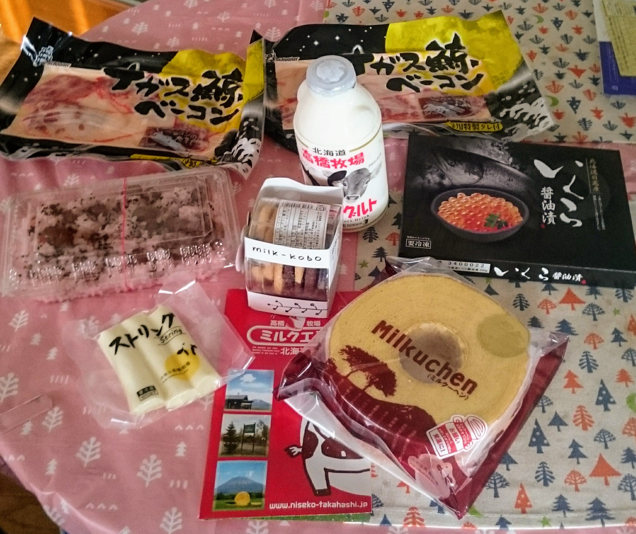 叔母が新聞の懸賞で当たったというバウムクーヘン、チーズ、ヨーグルト、クッキー。凄い!それに、鯨のベーコンにイクラ。お赤飯。こんなに戴いた…!叔母は食べられない物が多くて何故なのだろうと驚く事が多々あります。例えば、筋子は大好物なのにイクラは駄目だと言います。ほとんど信じられません!牡蠣も駄目で、叔父の実家から知内産の生ガキを箱で貰った事もありました。雲丹も駄目。鮑は大好物。うどん、ラーメンは駄目で蕎麦はOK。牛、鶏、羊は駄目で豚がOK。こんな感じです。それでもお寿司屋さんへ行くのが好きなようだから、叔父の退院祝いはお寿司だなぁ。