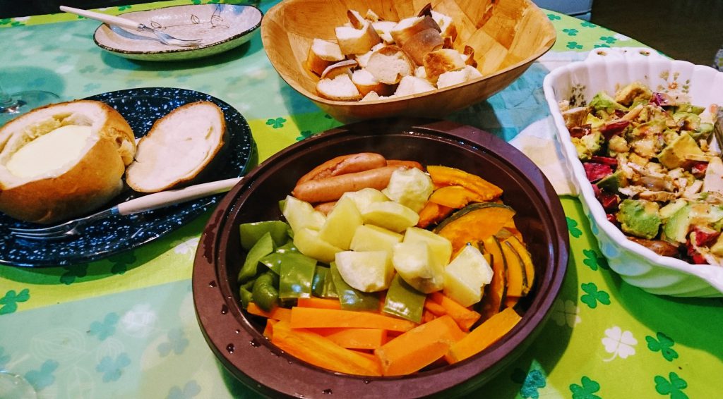 パンを焼きたいはじめさんは張り切って夕食の準備をしていました。これっぽちも入らないと思いながら私はサラダだけ作りました。タジン鍋で温野菜を作ったり、2種のパンを作ってチーズを投入。チーズフォンデュは市販のでとても安かったから期待していなかったのにメチャクチャ美味しくて、びっくりでした。