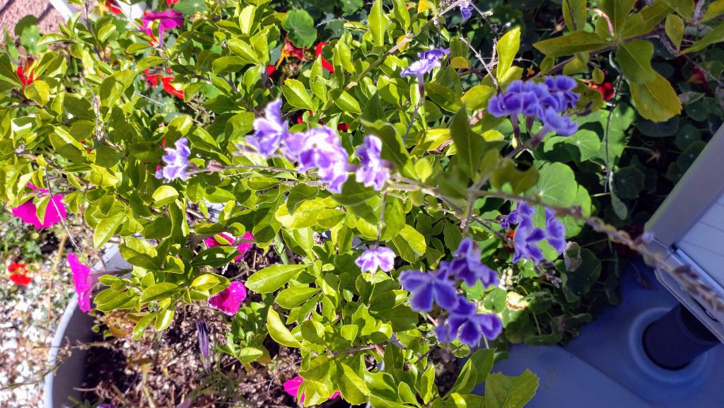 春に外に出したときは、しばらく花は付けませんでしたが、気温が上がってから紫の花を徐々に付けて可愛い。