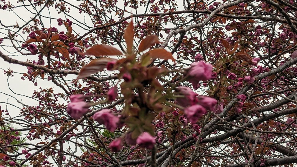余市川沿いの桜もすっかり散ってしまいましたが、グランドの中には遅咲きの桜が開花の準備をしていました。八重桜で濃いピンク色です。