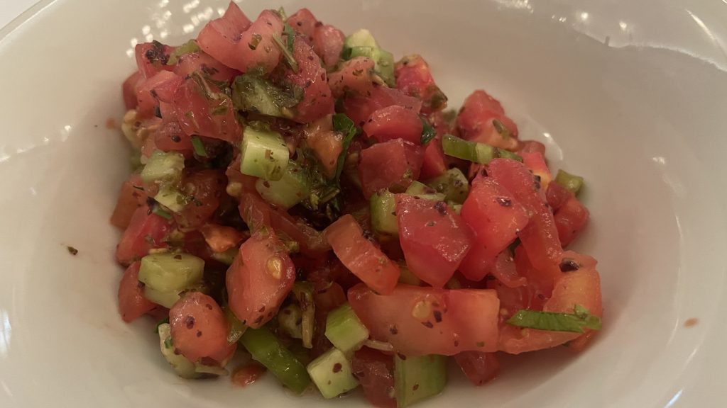 トマトとキュウリを和えたもの。やはりハーブが独特でした。どこのレストランでも、これが登場するので、「お決まりのサラダだ!」と笑っていました。