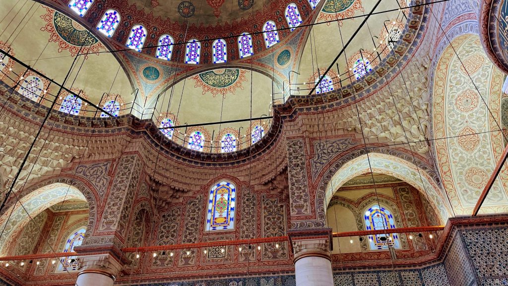 壁や柱に2万枚以上もの青を基調としたイズニックタイルが敷き詰められています。トルコといえばチューリップが代表的な花なのだそうです。そして、260枚以上の窓には、植物や幾何学的な模様のステンドグラスがはめ込まれ、神秘的に照らしていました。