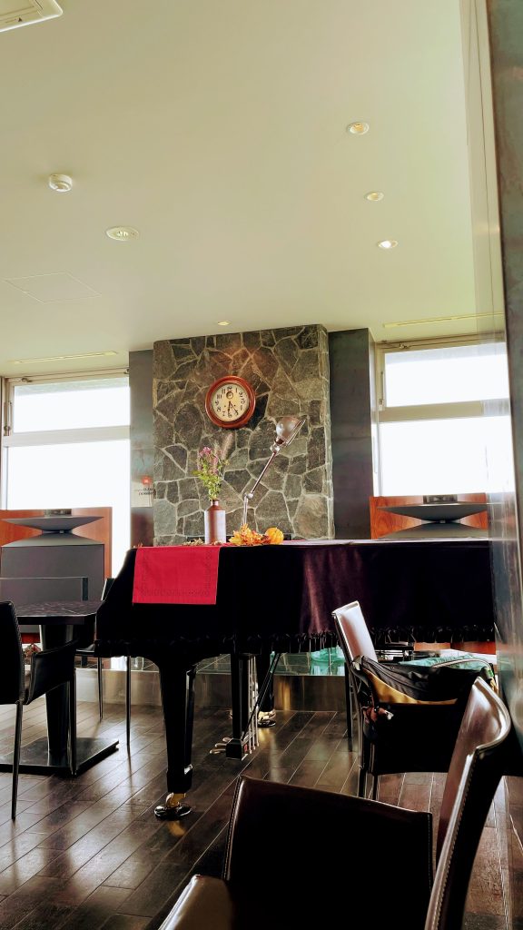 前面ガラス張りで、素敵な空間。店内にはジャズが流れ、グランドピアノが置いてありました。