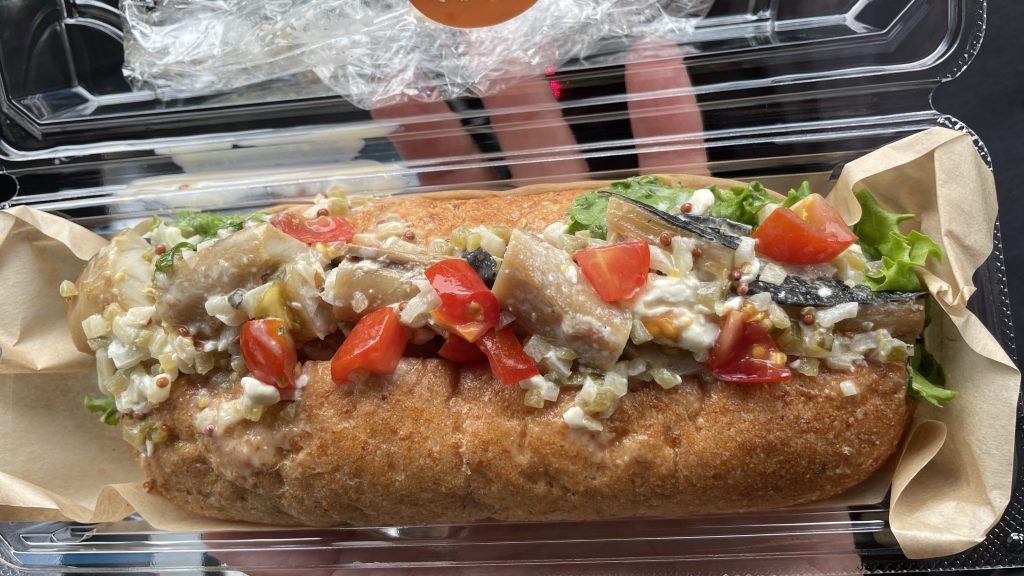 苫小牧の王子サーモンにやってきました。雨は全く止む様子がありません。なんと王子サーモンもお祭りで、店内に入ると色々と特典がありました。そして、なんと鯖サンドを発見!燻製サバ味噌マヨオープンサンドですが、2人で1個で十分なボリュームで、とっても美味しかったです。
