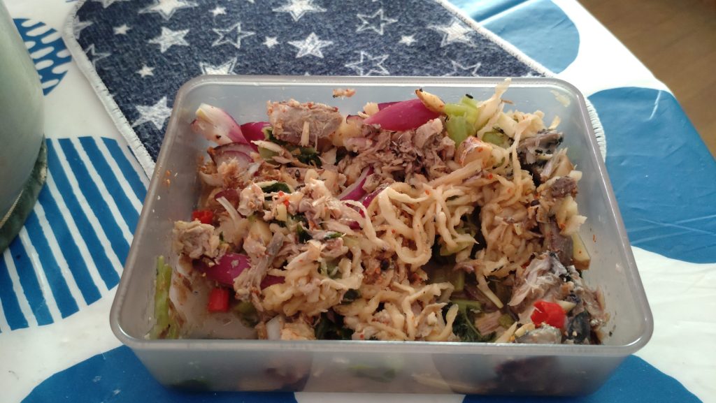 いとう食品の「あいこちゃんの鯖缶」を常備しています。脂ののった国産のサバを「沖縄の塩 シママース」のみで煮つけたのと、黒酢・切り干し大根・大根菜・紫玉ねぎで和えました。赤いのは遠軽の道の駅で買った唐辛子。