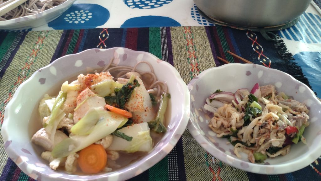 お蕎麦は一束ですが、温かい蕎麦で具沢山だとスープが残りました。残ったスープは夕食にまわします。