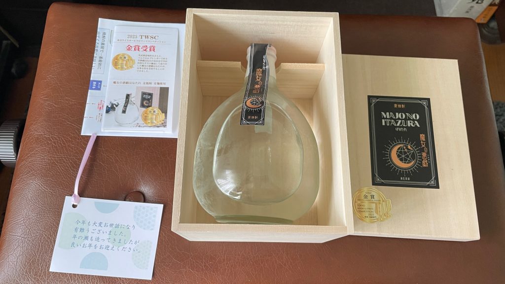 箱を開けると、今度は綺麗な桐の箱。しかも、メチャクチャお洒落。「魔女の悪戯はなたれ」というネーミングがまた面白い。コロンとしたボトルが可愛い。高級な麦焼酎が届いてビックリ。ここのところビックリの連続です。あありがとうございました!