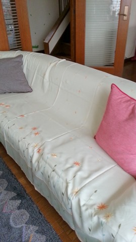 おニューのソファーカバーに替えました。ソファーは1個1個セパレートになっていますが、ズシッと重く、掃除機をかけて一人で黙々作業すると、結構ハードでした。汗をかきましたのでシャワーを浴びました。気分もスッキリ!