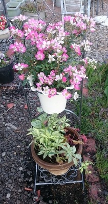 ピンクのミニバラは、はじめさんのお気にい入り。バラは刺があって毎年ケガをするのでウンザリだと言っているのに、これも刺がありますよ。でも、可愛いなぁ。右の黒い鉢の寄植えは玄関に置いたらパッとしなかったのですが、庭に持ってきたら映えます。