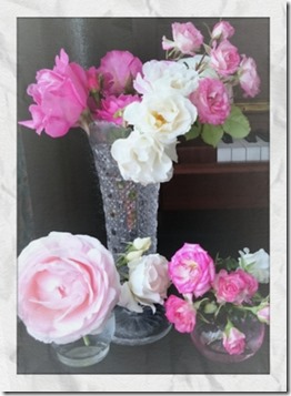 色々な種類の薔薇を摘んできて、あちらこちらに活けました。