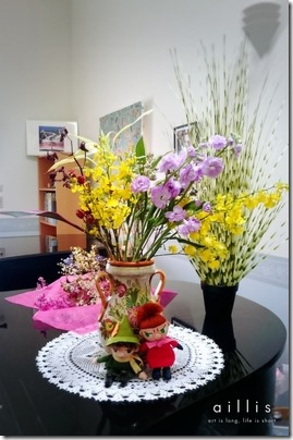 お花は2件で選びました。鮮やかな黄色のオンシジュームに、この紫の八重咲きストックが優しい雰囲気で好きです。