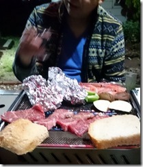 ガーデン焼き焼きを試みましたが、風が強くパラソルが壊れそうなので、家の中に入りました。ハネシタというお肉が美味しかったです。
