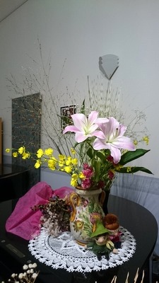 発表会のお花に少し足しました。秋らしさも添えて。車旅へ出掛ける前は蕾だったユリが帰宅したら開いていました。長持ちで良い香りで大好きです。