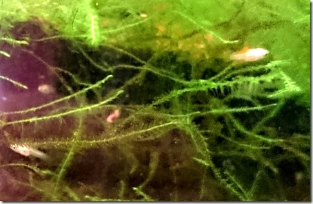 稚魚はウィローモスの影に隠れて居るものが普通ですが、最近は生まれて間もない小さい稚魚が水槽の上の方に平気で居たりします。食べられないのかとヒヤヒヤしますが、成魚は「危ないから下に行きなさい」という風に諭したりしているような光景が見られます。