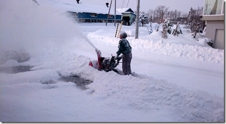 家の前を往復して、今度は庭です。私は除雪機が残した雪を片付けて、アルデオ君の雪を落とし、車の周りの雪を片付けました。30分くらい貢献しました。(^^;