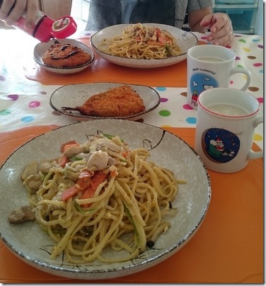 ランチは「もちもち和風パスタ」。うどんのような太麺でボリュームがあり、あじフライまで辿り着けませんでした。