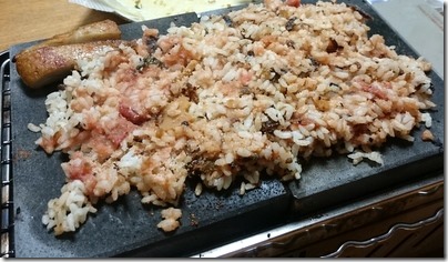 2合炊いたご飯の残りで「たらこ焼き飯」を作ってみました。溶岩プレートで焼くとカリッとお煎餅のようになって美味しかったです。