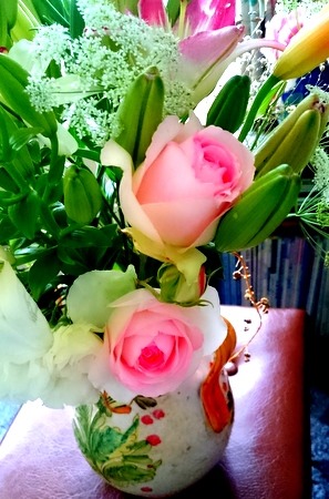 叔母から貰ったユリと我が家の薔薇を活けました。ゴージャスです!