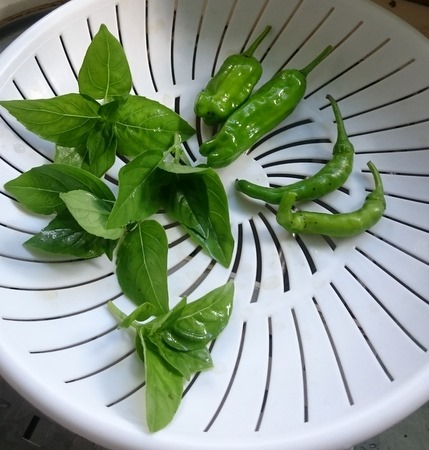 雨が続いていた庭に出ると、ちょっと収穫できた。バジルはこんもりと育って、シシトウは大きいのが成っていた。激辛南蛮は2本だけ。辛そう!