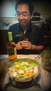 午後8時近くまでかかり、休日の夕食。彩り野菜と鶏もも肉の旨味が詰まったお鍋。キャンプ用に買ったこのお鍋がお気に入りです。久しぶりにブランデーのような白ワインと合わせました。明日も頑張ろう。
