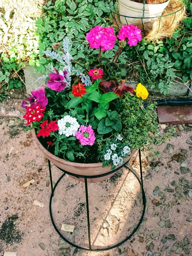 色々なお花を使って寄せ植えしてみました。先日はじめさんに買ってきてもらった苗は小さくて、これからもう少し大きく育ってくれることを期待。