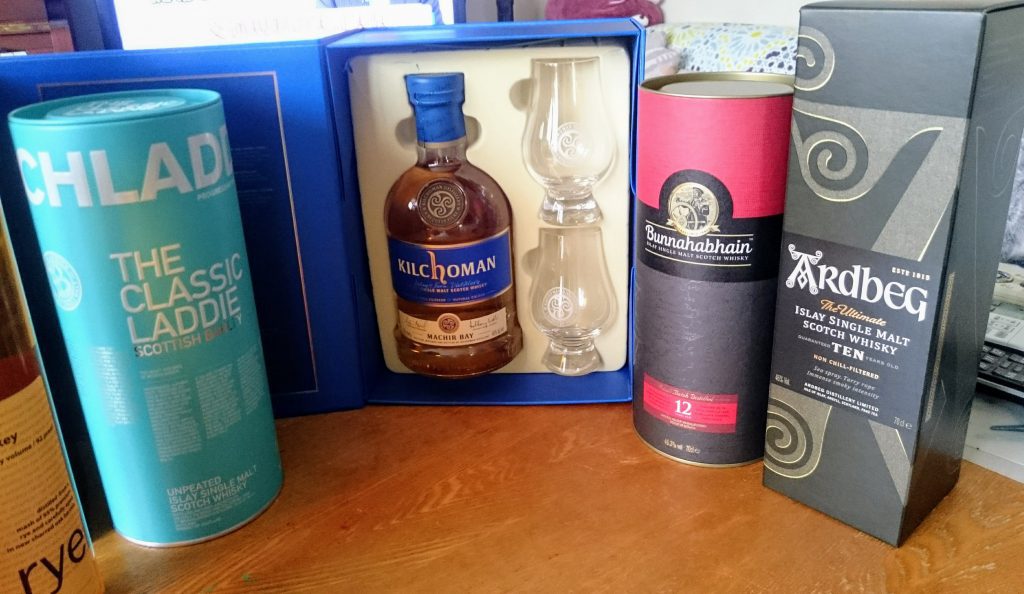 アイラ島にウイスキーの蒸留所は全部で8カ所あるのですが、はじめさんに教えると各蒸留所の代表を買ったので8本!それとライウイスキーが2本届きました。ラフロイグとボウモア、ラガヴーリンは飲んだことがあるので、今日はグラス付のグラスで他の銘柄を飲んでみます。