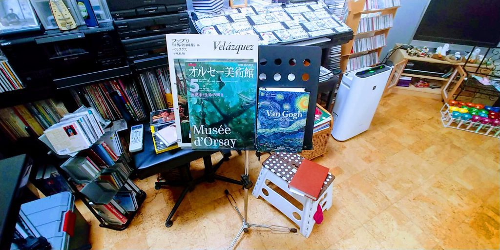 物品倉庫みたいになっている2階の踊り場。ここを整理していたらお宝が出てきた!?お手頃価格の時に買っていた竹鶴17や21が複数本あり、余市も何故かコンビニに売っていたのを買いためていたもの。M画伯が結婚祝いに描いてくれた肖像画も飾っています。