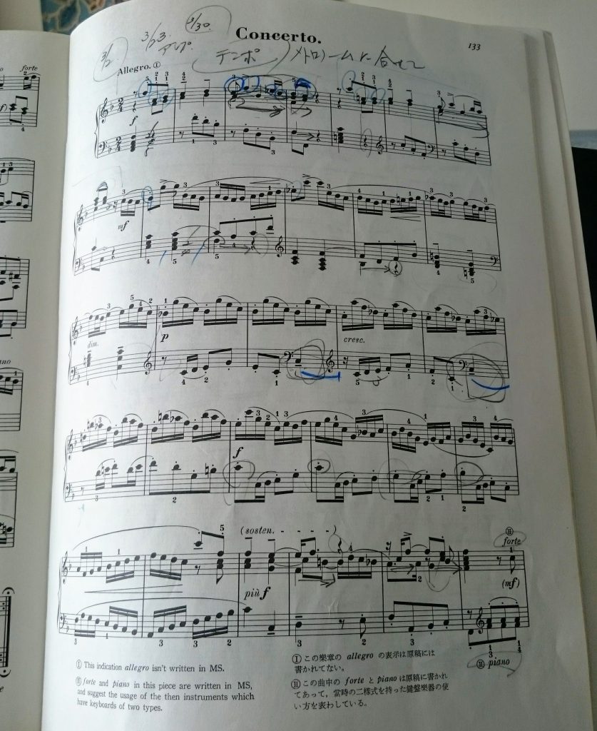 青い書き込みは音大の先生のもの。冒頭から注意されたのを覚えています。3小節目のテーマ「ド、ファー、ミレ、レ、ド」なのに「ド、ファー、シミレ、レ、ド」と弾いていました。(^^;