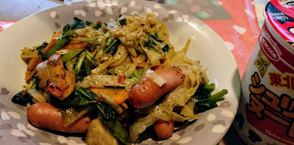 ランチは野菜炒めとエースコックのシュリンプヌードル。子供のときに時々食べましたが、ちょっと違うように感じました。はじめさんは日清派だったようです。