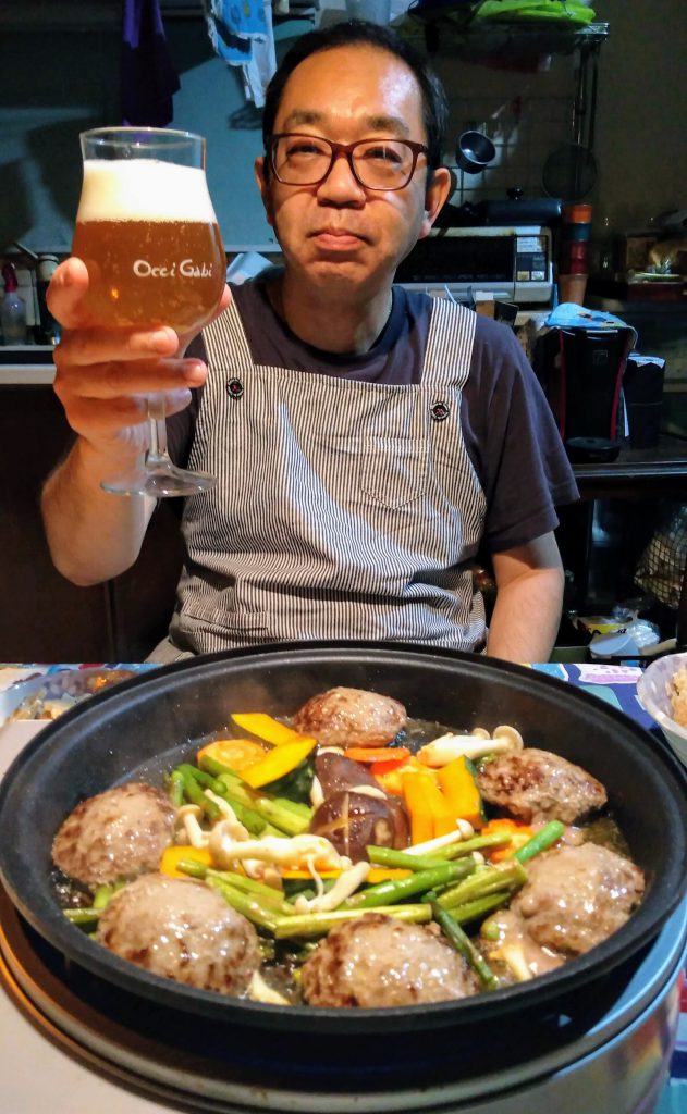 ピルスナーはそんなに泡が立ちませんが、バナナの味がするヴァイスは泡が立つので注ぎ方が難しいです。上手く注げてどや顔のはじめさん。ハンバーグにもよく合って美味しかったです。明日もガンバロ~♪