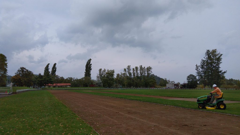 午前中ウォーキングに出掛けました。曇り空のした、グランドではクルクルと芝刈りの車が。