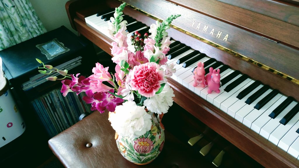 先週の白のカーネーションに華やかな濃いピンクのカーネーションやピンクのストックを飾りました。今日から4月のスタートということで、お部屋も明るく華やかな雰囲気になりました。