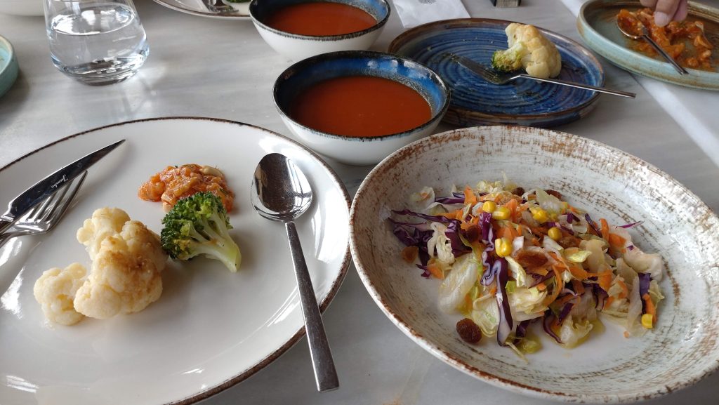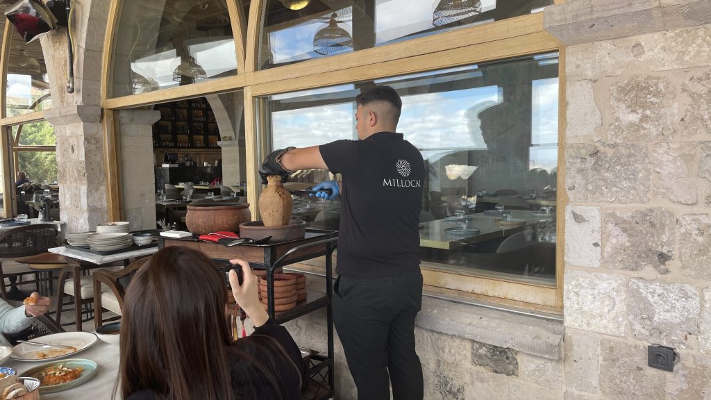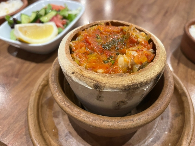 カッパドキアのランチでは名物の壺焼きケバブを食べました。しかし、メインの前に茹ですぎた大きなブロッコリーとカリフラワーが出て、横に並んだテーブル10人くらいで、ようやく食べたと思ったら、なんとまた茹ですぎの同じ野菜の皿が登場して驚きました。