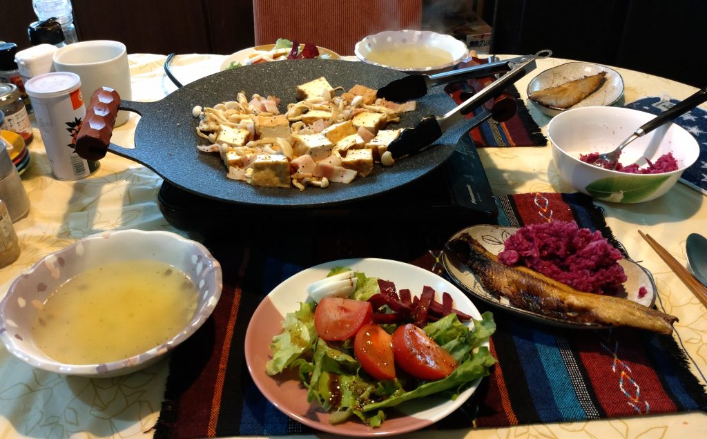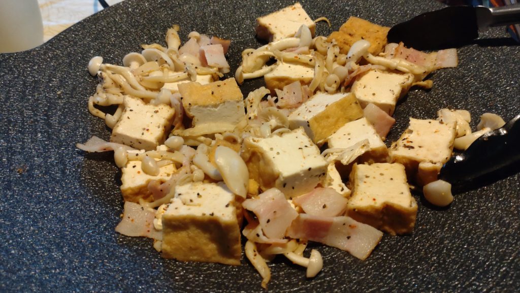 主食は、厚揚げ豆腐と、ぶなしめじとベーコン炒め。グリドルでチャチャチャと作りながら食べます。簡単で、後片付けもラクチン。