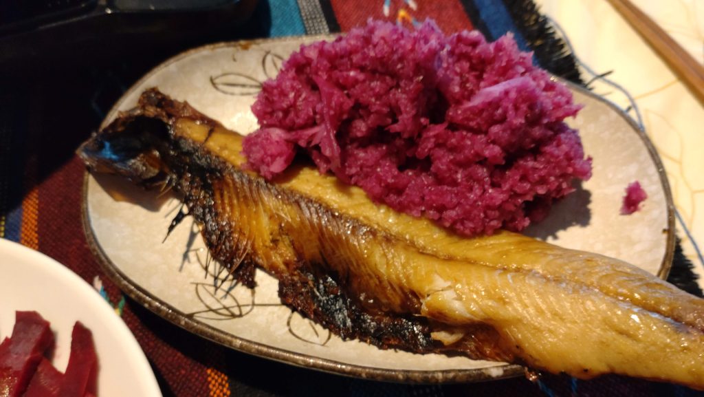 身欠きにしんに赤い大根おろしを添えました。紅しぐれ大根で、ビーツと同じような鮮やかな色。白い大根より甘みを感じました。残りはサラダ用にしました。