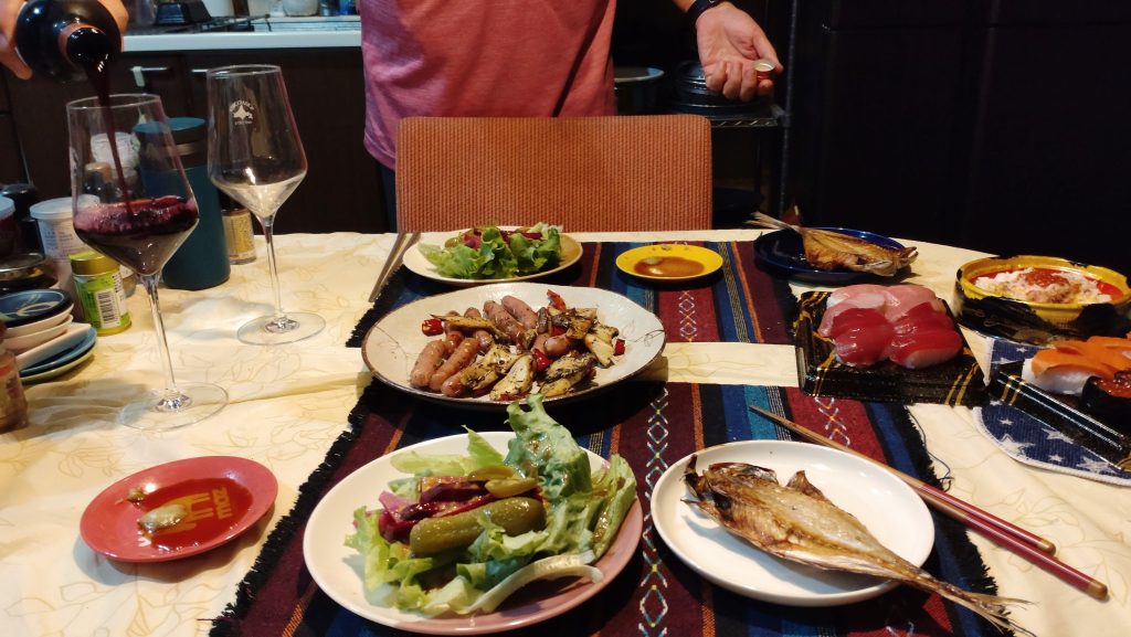 流石にグループレッスン2本立てだと、夕食は簡単に用意できるものに。アジを焼き、キノコとウインナーを炒め、ミニサラダとお寿司な夕食。あとはセコマのワンコイン・ワインがあれば幸せです。