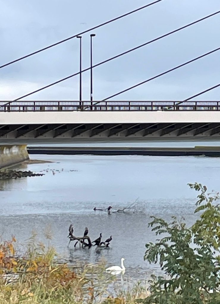 一羽でも存在感が半端ない。遠くからでも、すぐに白鳥だと分かりました。大川橋から白鳥を見るのは初めてです。それにしても、白鳥が一羽だけいるのは珍しく、渡りの途中で群れから離れたのか、親鳥から独立した若鳥なのでしょうか。