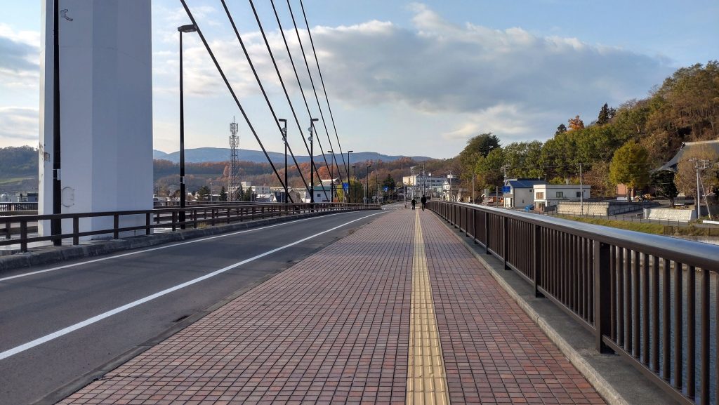 広々とした大川橋の歩道。此処から余市橋の方を見るとニッカ工場が見えるので、3人が横並びになってスマホで写真を撮っていました。