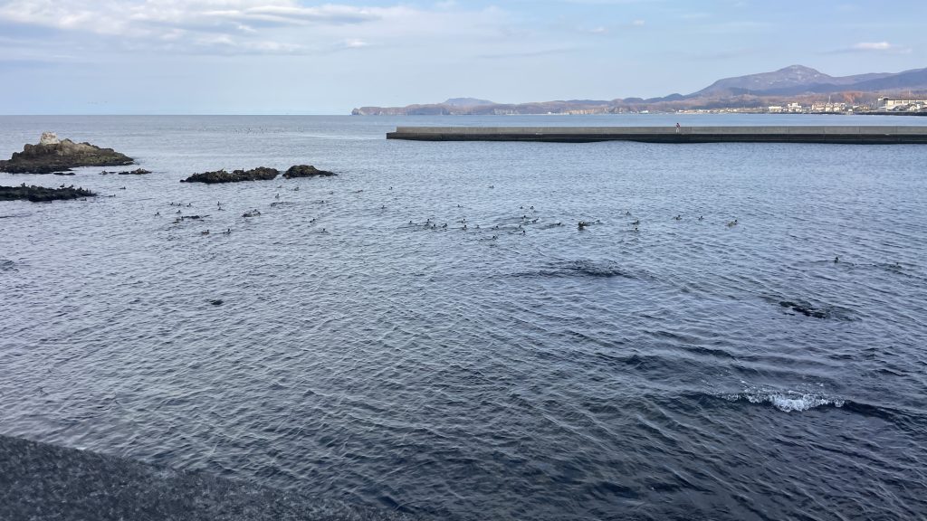 昨日に続き今日も天気が良く、余市マリーナへ行くと駐車場に車がたくさん停まっていて釣り人が多かった。今日は防波堤コースではなく大川橋を歩くことにした。海には鴨の群れと、奥にはカモメの群れが。