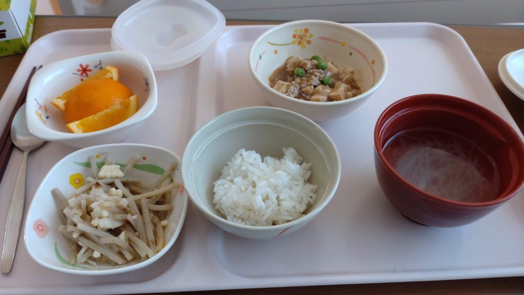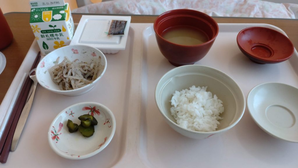 最後の夕食。食べないと朝までお腹が空くのでかん完食したが、スパイスが使われず甘い味つけがどうも。スパイスを持参したら少し良くなるかもしれない。ホタテスープとフレッシュレタス&トマトでなんとかサマになった。午後7時になったら珈琲を飲みながら、茹で卵を食べよう。今回の病院食は1200calなのだそう。私は1400calと医師にいわれているので、やはり「ゆで卵」やサラダで補う前提の食事だったのだと思う。そういう意味では感謝です!