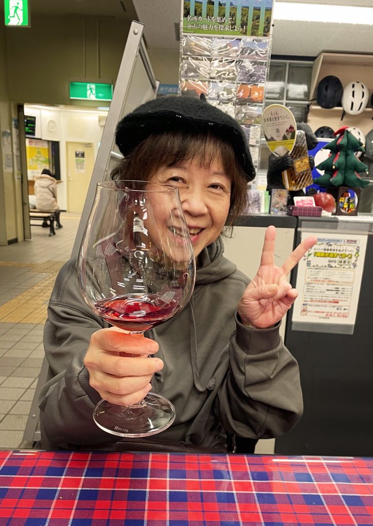 余市駅内にあるエルラプラザでは余市産の葡萄で造られたワインを飲むことができます。300円と500円のがあり、500円にすると大きなグラスで飲むことができます。ちょっとピカソのような写真で可笑しいですが、田崎さんのピノが最高でした!